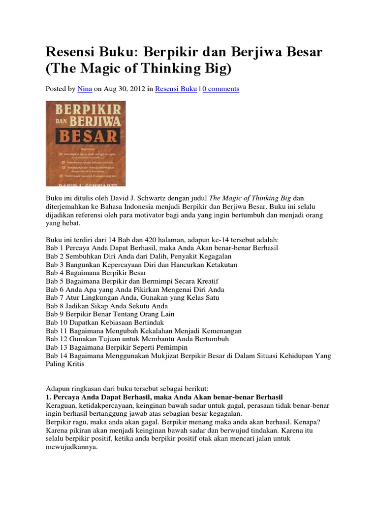 There are 13 chapters in David J. Before we can achieve BIG things we have. Berpikir dan Berjiwa Besar The Magic of Thinking Big Posted by Nina on Aug 30 2012 in Resensi Buku 0 comments.